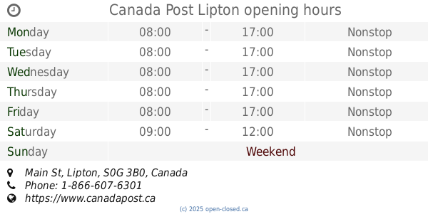 It is also possible to : Edit these OPENING HOURS of Branch Canada Post In Lipton, Main St,
